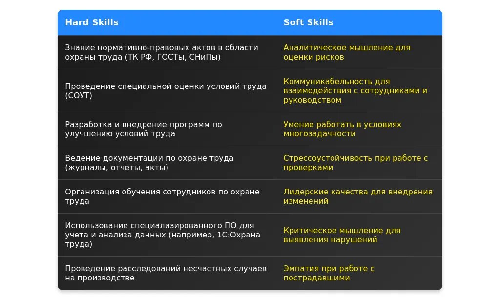 Обязательная информация: ключевые навыки, опыт (если есть), профессиональные достижения, личные качества, которые важны для работы в охране труда.