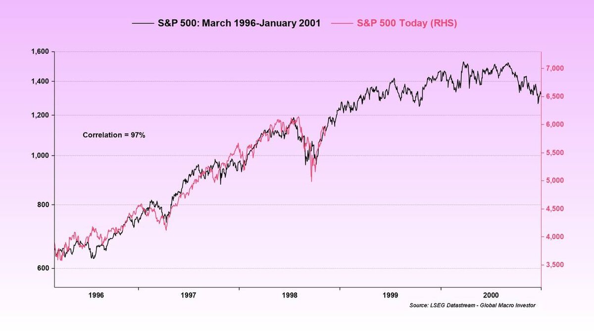97% совпадения: мы снова в 2000 году? Инвесторы, этот график — не просто совпадение. Это зеркалка. S&P 500 сегодня (розовая линия) двигается почти идентично тому, что было перед крахом доткомов в 2000-м. Корреляция — 97%. Такая точность — редкость даже для фрактальных паттернов. Что это может значить? — В конце 90-х рынок был на эйфории: технологический бум, IPO, рост «без прибыли» — Тогда тоже был переход от дешёвых денег к ужесточению политики — Всё закончилось обвалом, зачисткой пузырей и возвратом к реальной экономике Знакомо? Сегодня мы снова: — видим бешеный рост AI-компаний — игнорируем фундаментальные оценки — наблюдаем рост долгосрочных ставок и давление на ликвидность Вопрос не в том, повторится ли всё точно. Вопрос — когда и в какой мы в фазе. Если аналогия сохраняется, мы сейчас в районе финального “вздоха эйфории”. А дальше — либо мягкая посадка, либо… снова 2001. Хотите, чтобы я сделал серию постов: какие сигналы говорили о пике тогда и как они проявляются сейча