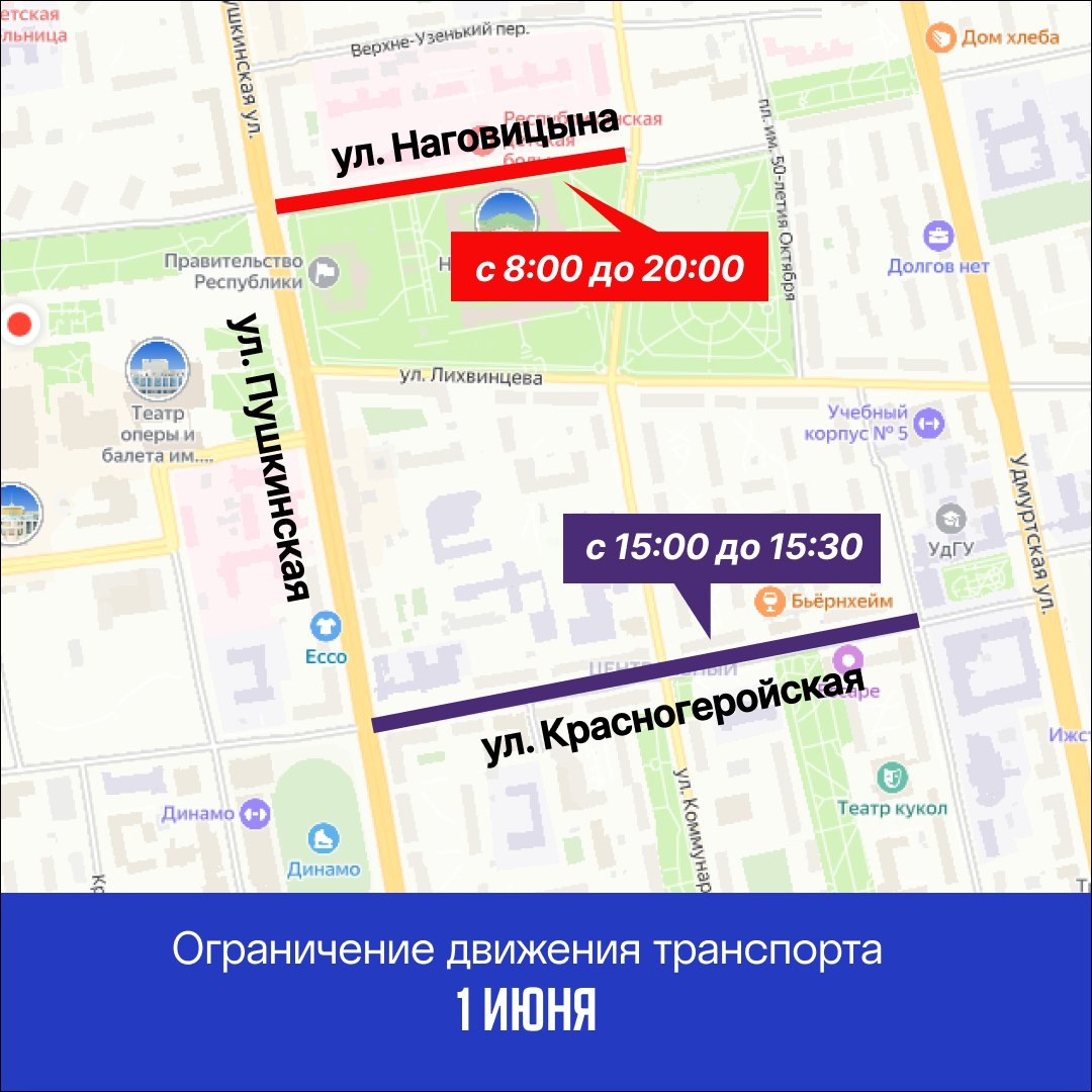 ⛔️В Ижевске ограничат движение по улицам Наговицына и Красногеройская 1 июня