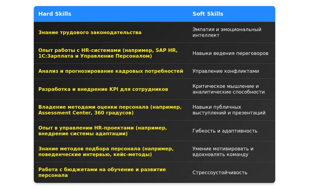 - Навыки ведения переговоров с кандидатами и сотрудниками.