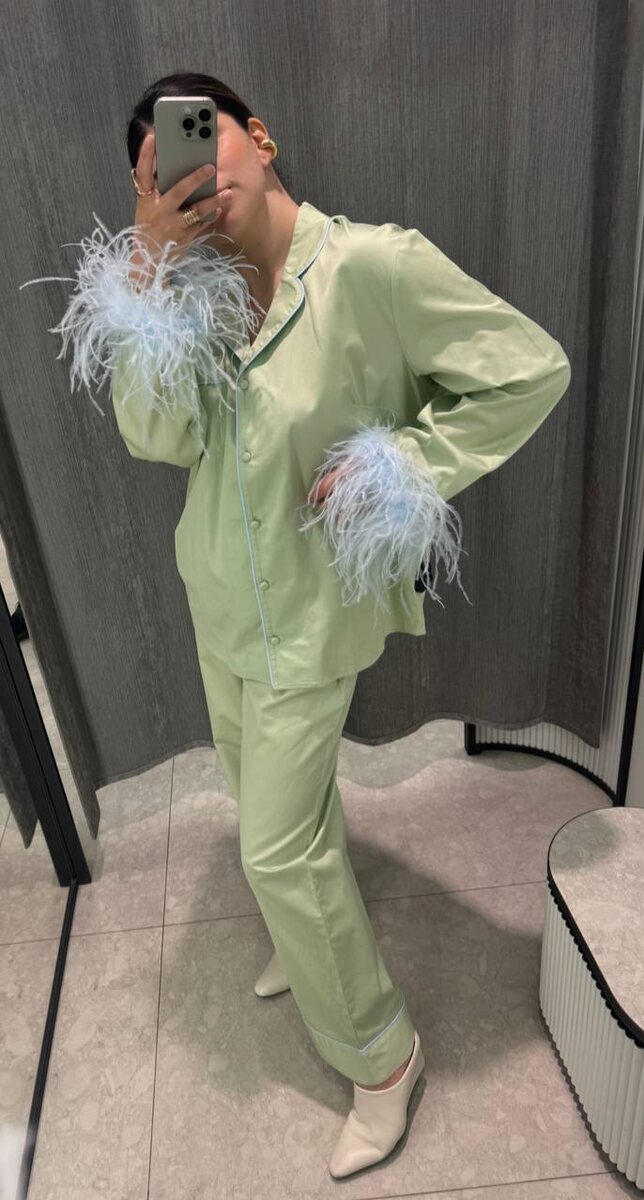 Примерила вчера пижаму Lime, про которую говорила тут Очень хороша! Перья супер, учитывая, что я помахала крыльями в примерочной, а ничего не отлетело, то вообще приятно 😁 Стилизовать пижамные брюки отдельно думаю вы уже все знаете как, а блузку показываю что тоже можно. Даже без подготовки сразу ко вчерашней юбке подошла. Ну шик!