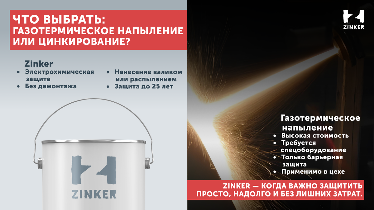 Вопрос защиты металлоконструкций от коррозии стоит особенно остро в строительстве, промышленности и энергетике. Среди современных решений выделяются два популярных метода: газотермическое напыление и цинкирование. В этой статье сравним их по ключевым параметрам: стоимость, долговечность, сложность, применимость в разных условиях. Это метод, при котором расплавленный металл (обычно цинк, алюминий или их сплавы) распыляется на поверхность конструкции при помощи специального оборудования. Покрытие наносится послойно, формируя барьер от коррозии. Плюсы: Минусы: Цинкирование — это метод электрохимической защиты, при котором на поверхность наносится состав с высоким содержанием активного цинка Zinker). Цинк образует гальваническую пару с металлом и работает как протектор: разрушаясь первым, он сохраняет основную конструкцию. Плюсы: Минусы: Газотермическое напыление оправдано: Zinker оправдано: Газотермическое напыление — это дорогая, но эффективная барьерная защита, требующая условий цеха и