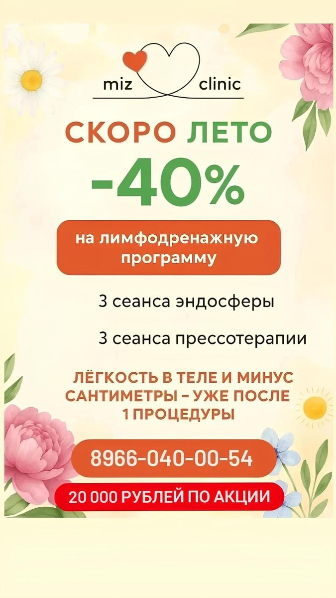 🌸 Welcome Весна в Мизклиник! 🌸 Весна — время обновления и новых возможностей! Если вы хотите сбросить лишние килограммы и сиять на весеннем корпоративе, наша акция «Welcome Весна» как раз для вас! 💥 Скидка 40% на программу, которая поможет вам выглядеть прекрасно и чувствовать себя уверенно! Выгода — 12 100 рублей! Состав программы: - 3 сеанса лимфодренажного массажа Эндосфера - 3 сеанса прессотерапии 💰 Всего за 20 000 рублей вместо 32 100 рублей! Не упустите шанс сделать себя еще красивее и привлекательнее этой весной! Запишитесь на процедуру по номеру: 📞 8(966)-040-00-54 Давайте встретим весну вместе, и пусть она принесет вам радость, уверенность и новые достижения! ✨