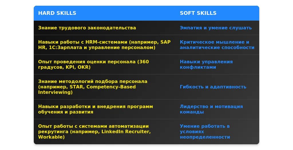 После адаптации: "Навыки подбора технических специалистов, знание Agile-методологий, опыт внедрения HR-систем."