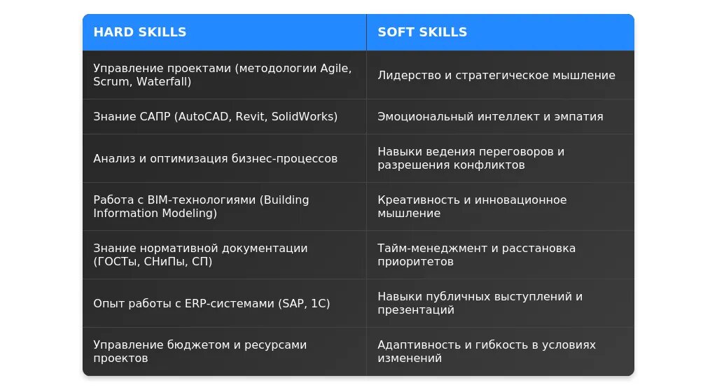 - Ключевые навыки и компетенции (управление проектами, техническая экспертиза, командная работа).