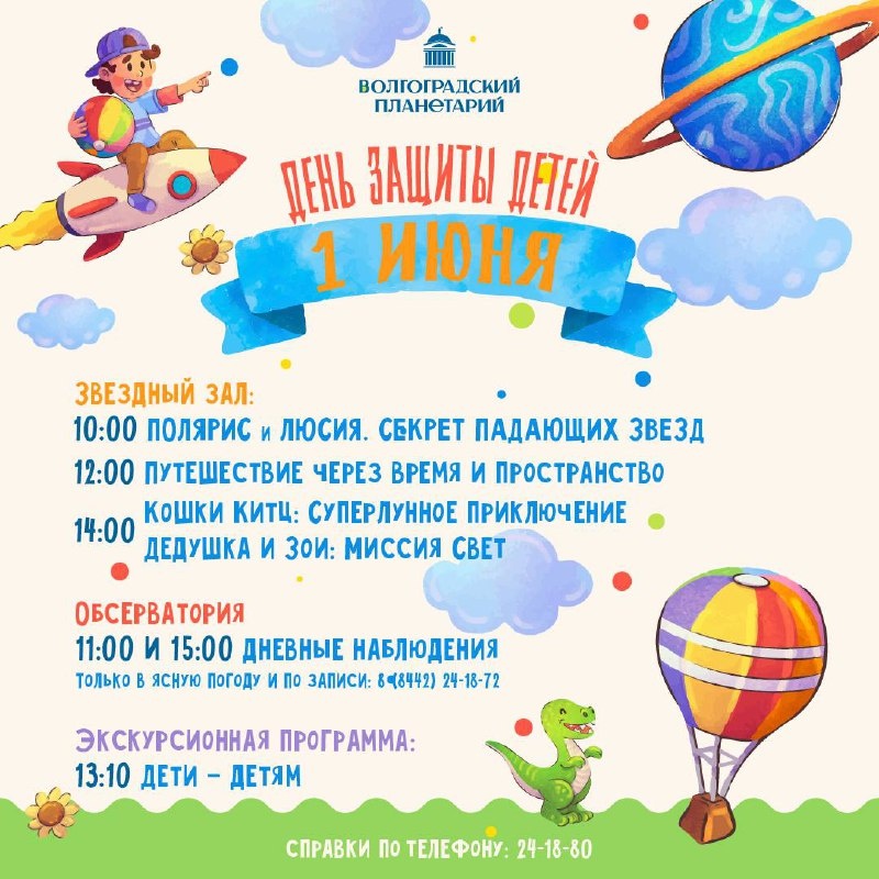 ................................................ ДЕНЬ ЗАЩИТЫ ДЕТЕЙ В ПЛАНЕТАРИИ #ТематическиеПрограммыВолгоградскогоПланетария ................................................ ⠀ ⠀ По доброй традиции, 1 июня в 13:10 приглашаем юных исследователей на уникальную экскурсионную программу "Дети — детям"!🌟 ⠀ ⠀ ✔ Юные экскурсоводы из астрономического клуба "Альциона" расскажут об истории планетария и его удивительных экспонатах. ✔ Проведут зрелищный эксперимент с маятником Фуко. ✔ Прогуляются с вами по астрономической площадке, расскажут про астрономические предметы на ней, а также поведают, что такое обсерватория и как попасть на её программы ⠀ ⠀ 📌 ВАЖНО! ⠀ В связи с ограниченным количеством мест необходимо приобретение нулевых билетов! ⠀ Приходите окунуться в мир космоса вместе с нами! 🚀 Космос ближе, чем кажется - ПОДПИСАТЬСЯ - Волгоградский планетарий
