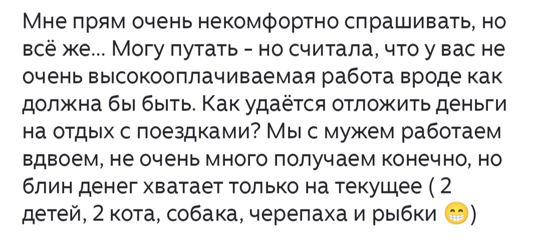 Поводом для этой статьи послужил вот этот комментарий: В двух словах я смогла только ответить, что ни рыбок, ни черепахи у меня нет))), впрочем как и собаки, только одна кошка. А теперь серьезно. Собственно, в своём блоге я довольно часто пишу про разумную экономию и расстановку приоритетов. Сейчас, правда, реже. Потому как, заботят сейчас, меня, немного другие аспекты жизни. Финансовые вопросы, конечно, важны, но сейчас совсем не на первом месте. К счастью, вопрос именно, выживания, у меня не стоит))). Тема эта очень объёмная. Собственно, каждый решает для себя на чем он может экономить, а на чём нет. Что для него важнее, а что может подождать. Например, в моей семье нет культа еды, мы совершенно спокойно к этому относимся. Предпочитаем простую еду. Соответственно, траты на еду не особо большие. Особенно сейчас, когда мы живём вчетвером - я и дети. Как то и аппетита особо ни у кого нет. Кстати, побочным приятным эффектом оказалось снижение веса. Также пользуюсь акциями, скидками,