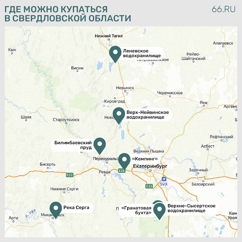 Санитарные службы и спасатели МЧС определили семь легальных для купания озер, водохранилищ, прудов и рек Свердловской области, где поблизости есть спасательные станции, имеется безопасное дно и отсутствует большое количество паразитов. Это пляжи: Детальнее карту можно посмотреть здесь. В Екатеринбурге 30-градусная жара держится с 8 июня. В длинные выходные погода испортится. 12-13 июня пройдут дожди с грозами. 14-15 ожидается минимальное количество осадков и комфортная температура воздуха +23...+24 градуса. Главная новость по теме