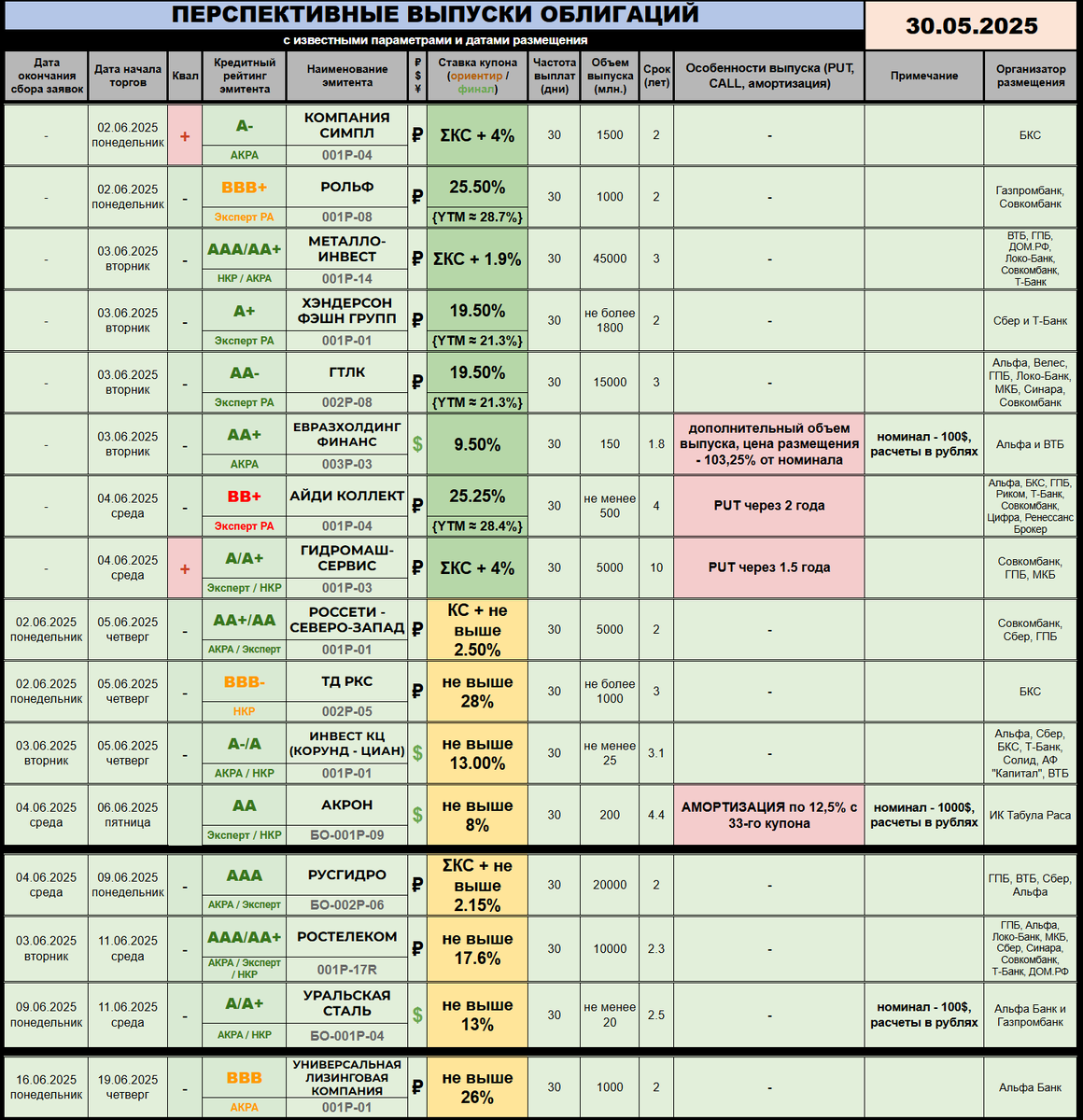 ---------- 🆕 НОВЫЕ РАЗМЕЩЕНИЯ / АНОНСЫ: 🌷 АКРОН (🅰️🅰️) вновь идет занимать в квазивалюте, и делает это традиционно недорого для себя. Выпуск БО-001Р-09 в студии объемом 200 миллионов долларов. Номинал одной бумаги - 1000 долларов, расчеты в рублях. Сбор заявок состоится 4 июня, срок обращения составит аж 4,4 года. Купоны будут ежемесячными, их стартовый ориентир не выше 8%. Оферт нет, а вот ежеквартальная амортизация с 33-го купона прилагается, по 12,5% от номинала. Торги начнутся 6 июня, организатор - ИК Табула Раса. 🌷 УНИВЕРСАЛЬНАЯ ЛИЗИНГОВАЯ КОМПАНИЯ (🅱️🅱️🅱️) перенесла сбор заявок на дебютный выпуск. Теперь он состоится 16 июня, с началом торгов 19 числа. Видимо, решили, что после заседания ЦБ бумага станет привлекательнее, но очень спорно пока. Напомню, что двухлетний выпуск объемом 1 миллиард рублей на старте снаряжен ежемесячными купонами не выше