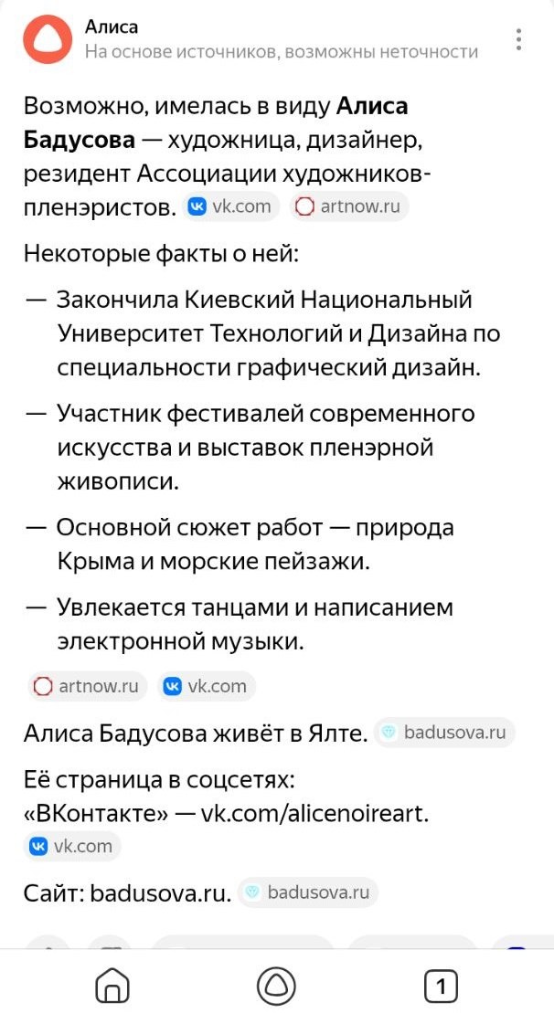 В ответ на пост 📊 Проработал оптимизацию по презентации сайту автора badusova.ru (Алиса Бадусова) писал ранее о проекте здесь Поисковые роботы уже начали подтягивать информацию и ключи, нейросеть на базе информации в описании подтягивает нужную информацию и ссылается на наши ссылки как качественного источника информации Нужно формировать корректное описание, создать био биографию автора - описание специалиста стримера которое будет соответствовать и находить аудитории через поиск и чтобы эта информация соответствовала желаниям и целям в продвижении своего имени бренда. Можно сделать так, что какой-то пост будет работать не разово и пропадать в ленте, а будет находиться и работать всегда, что увеличит касание с аудиторией и количество просмотров на канале автора, то есть регулярно возвращать зрителя на более старое видео если оно имеет актуальность в донесении информации или в вовлечении в проект К примеру при поиске и запросе "Вид на кафе Солярис в городе Ялта" будет находить и на