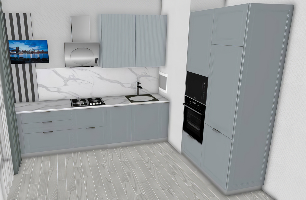 ⭐ Что помог предусмотреть 3D-проект: шкафы-пеналы кухни Регина идеально встроились в выделенное пространство ниши, не оставляя пустых зазоров. Бойлер, который из всех коммуникаций более всего мог испортить внешний вид, «спрятался» в навесной шкаф за рифленым фасадом Джаз.