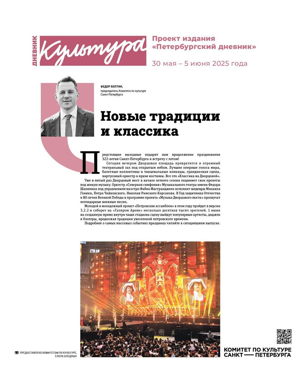 📰 А вы уже прочитали Культурную вкладку «Петербургского дневника»? Председатель Комитета по культуре Санкт-Петербурга Федор Болтин — о главных культурных мероприятиях, которые приурочены ко Дню города. Подробнее читайте в пятничном выпуске нашей газеты. Петербургский дневник