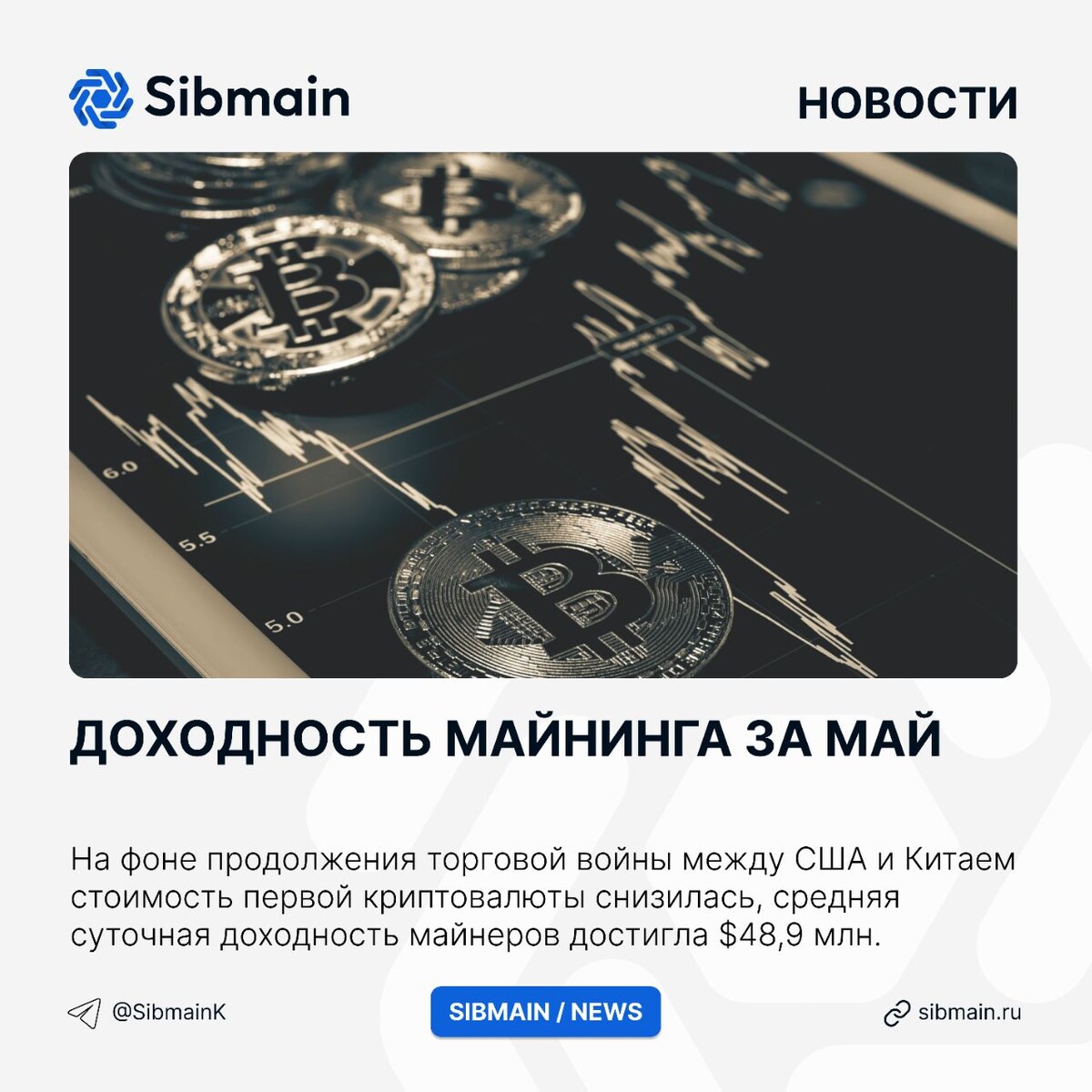 📰📰📰📰 ➡️Доходность майнинга за май На фоне продолжения торговой войны между США и Китаем стоимость первой криптовалюты снизилась, средняя суточная доходность майнеров достигла $48,9 млн. Месячные доходы майнеров биткоина за май достигли $1,42 млрд, увеличившись почти на 20% по сравнению с апрелем. Интересно, что 29 мая суточная доходность майнеров первой криптовалюты установила годовой максимум на уровне $52,1 млн. 📍Рост биткоина увеличил доходность майнинга в мае привлекая новых участников, использование эффективного оборудования становится гарантией прибыльности бизнеса. Sibmain комплексные решения для майнинга под ключ! - Поставки майнинг оборудования - Дата-центр в Красноярске 80 МВт - Размещение от 5 руб/кВтч ⌨️ Нужна консультация или помощь в подборе оборудования? Звоните: +7(800)351-14-70 📍 г. Москва Калужская площадь д.1 к.1 💬 WhatsApp 💬 @Sibmain_salesbot 🌐 sibmain.ru
