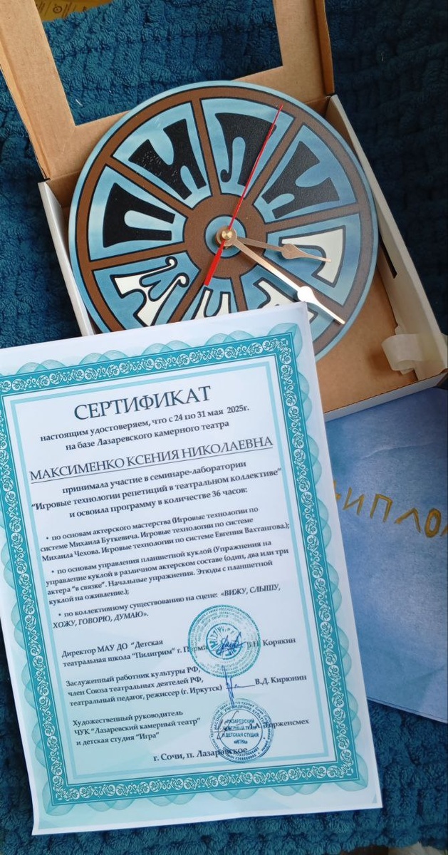 Ксения (учитель словесности, ТРИЗ и истории) сегодня окончила обучение на тетральном семинаре с особой наградой в виде часов с логотипом от руководителя Пермского театра за особую проявленность и активность в групповой работе. Конечно поделится опытом со всеми нашими учителями. Тем более скоро наш очный лагерь, где можно будет попрактиковаться.😜