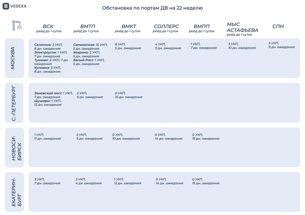 Обновлённая картина по перевозке контейнеров через порты Дальнего Востока — 22-я неделя Показываем, что происходит на терминалах Владивостока и Находки и как быстро контейнеры добираются до ключевых городов России. Среднее время ожидания контейнера перед отправкой сейчас составляет примерно 8–10 дней. ➡️ СПН(Сухой Порт Находки), мыс Астафьева и ВМПП — самые загруженные точки, где можно прождать до 15 дней. ➡️ В то же время на терминалах СОЛЛЕРС и ВМТП процесс идёт быстрее — ожидание всего 3–5 дней. 🚂 Среднее время в пути по железной дороге составляет 9–12 дней. 👉 Источник: @vedexx ❗️Важно: не путайте реальное время доставки из Китая с чистым временем движения контейнера! Большую часть времени контейнер просто стоит — ждёт «посадки» на судно, таможенного оформления, отправки по железной дороге и разгрузки. Ждет, ждет, ждет... Вот почему реальная скорость доставки автотранспортом от поставщика прямо до потребителя часто оказывается вдвое быстрее, чем перевозки контейнером, если