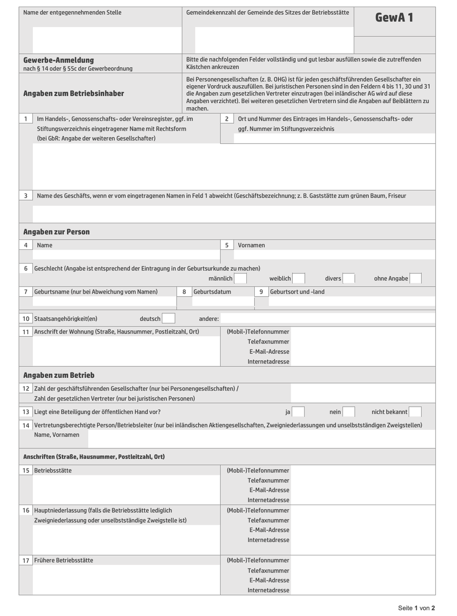 В первую очередь нужно обратиться в Gewerbeamt (бюро регистрации бизнеса) и заполнить заявление(gewa formular) на открытие предпринимательской деятельности. Форма занимает всего две страницы, в ней указываются: