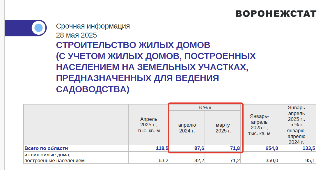 Но в целом ситуация пока не драматична – за счет большого объема ввода жилья в 1-м квартале за январь – апрель 2025 года отмечается приличный рост показателя – на 33,5 процента.