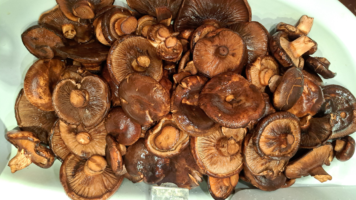 Лес сухой и растут только свинухи, набрали ведро рыбацкое, двенадцатилитровое, и ещё пакет. Это уже обработанные, готовые к варке