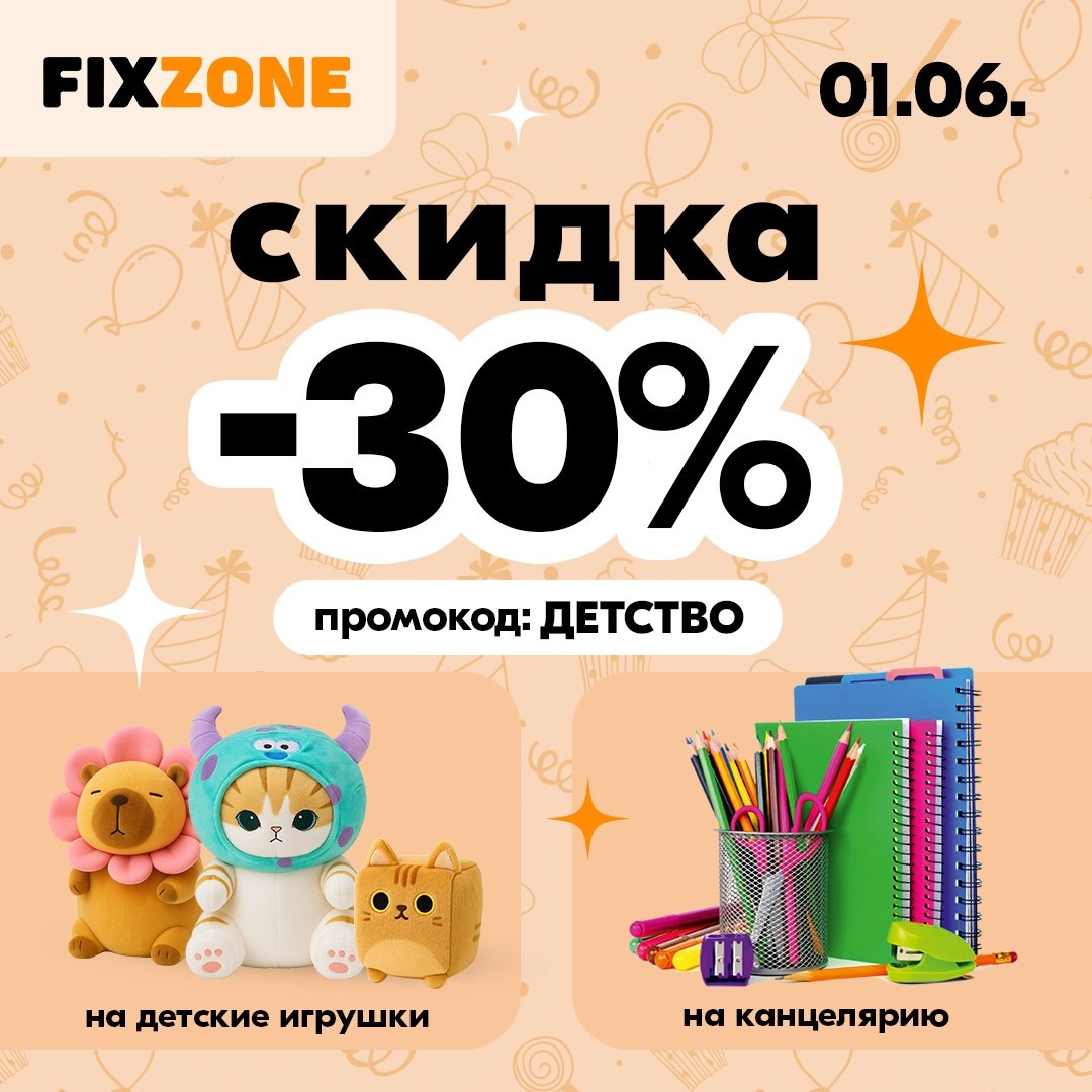 Празднуем День защиты детей вместе с FixZone! 🧸 1 июня дарим праздник всем детям и их родителям - скидку 30% на все игрушки и канцтовары в FixZone. Порадуйте ребёнка, обновите пенал или соберите подарочный набор —- выгодно, весело и по-доброму. ☺️ Акция действует только 1 июня — не пропустите!
