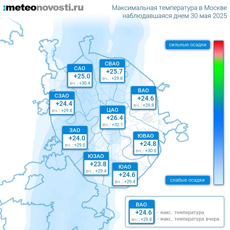 Самая высокая температура +26.4°C была зафиксирована в 12 часов в центре города, а холоднее всего было на юго-западе: +21.7°C. Разница по максимальной температуре в разных частях столицы составила за день целых 4.7°C.