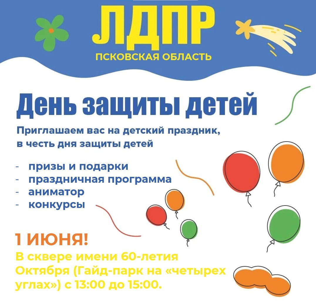 Уважаемые жители и гости города! 1 июня в честь Дня защиты детей Псковское региональное отделение ЛДПР приглашает вас на праздник. Он состоится в сквере имени 60-летия Октября (Гайд-парк на «четырех углах») с 13:00 до 15:00. Вас ждет: развлекательная программа с аниматором, песнями, танцами, конкурсами и подарками от ЛДПР. Вместе встретим первый день лета весело и ярко!