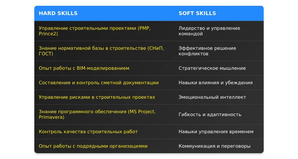 - Hard Skills: Управление проектами, BIM-моделирование, сметное дело.