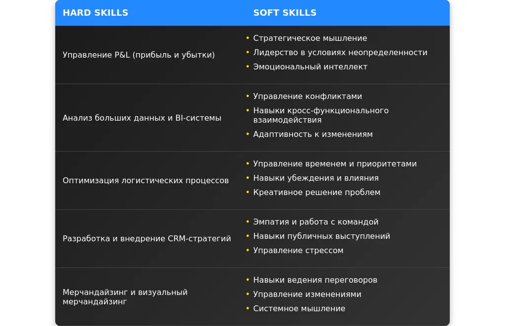Обязательные навыки включают управление продажами, бюджетирование и аналитику. В 2025 году актуальны такие инструменты, как ERP-системы, CRM и BI-аналитика.