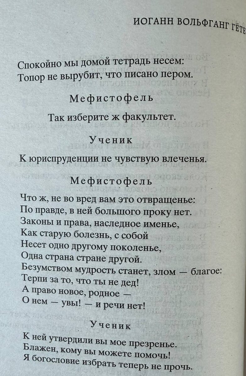 Утром читала «Фауста» Гёте и наткнулась на фрагмент, который заставил улыбнуться. В сцене беседы Мефистофеля и ученика обсуждается выбор профессии, и когда речь заходит о юриспруденции, ученик откровенно говорит: «К юриспруденции не чувствую влеченья». А Мефистофель, как водится, с ехидцей поддакивает: мол, и слава богу, всё равно от неё мало пользы — сплошное наследие старины, которое из века в век тянется, будто болезнь, и передаётся, не принося толку.