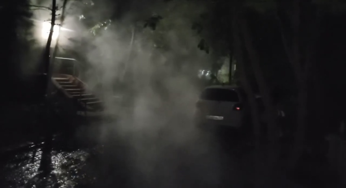 В омских Нефтяниках, на улице Мира, 23Б, ночью прорвало трубу. Из-под земли начал идти кипяток и улицу окутал эпичный густой туман. Кадрами с инцидентом поделились в группе «Омск Live» во «ВКонтакте».