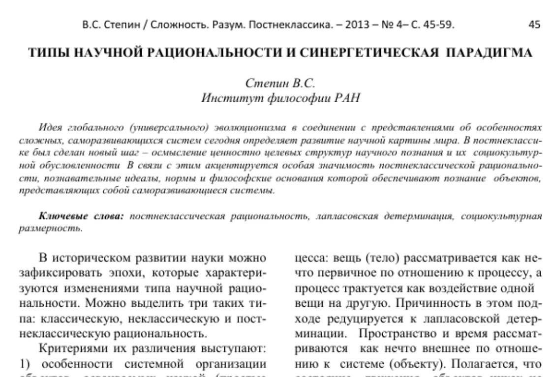 Четыре типа научной рациональности по В.С. Степину, - классическая, неклассическая, постнеклассическая и синергетическая (которая только формируется). Все типы рациональности существуют (в сознании ученых видимо) одновременно, ограничено только их проявление (видимо в общественном сознании, как некоей актуальной коллективной рефлексии). Все типы рациональности (рациональность - сводимость совокупности воспринимаемых явлений к неким законам, схемам, системам, закономерностям, абстракциям) рассматриваются от механических систем в классической науке (Декарт, Ньютон и пр.) к саморегулируемым системам, потом к саморазвивающимся и, наконец к неким "синтетическим" (мое название), которые или которая включает в себя и ценностные, этические категории. "... имманентно включает в себя рефлексию над ценностями ... представлениями о связи истинности и нравственности ... наука становится одни из важных факторов диалога культур Востока и Запада" (В.С.Степин "Типы научной рациональности и синергетическая парадигма" cyberleninka.ru/article/n/...).