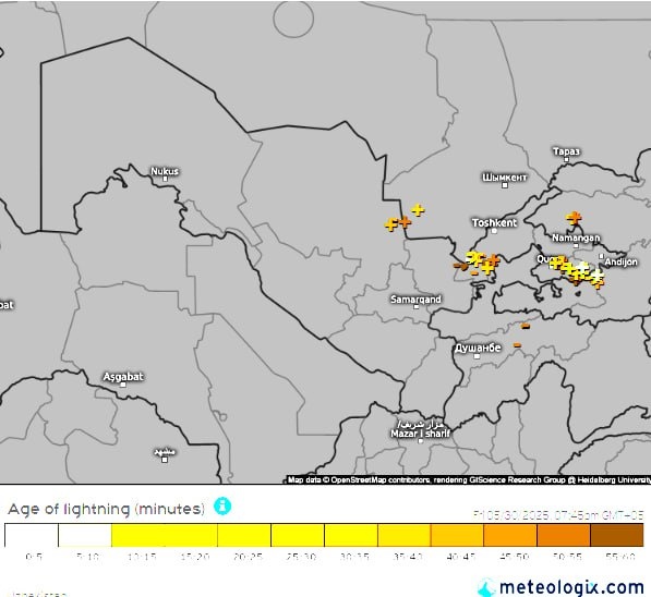 Soʻnggi bir soatlikda mintaqada kuzatilayotgan chaqmoq-momaqaldiroqli bulutlar qamrovi. Fargʻona viloyatida “chaqmoqlar raqsi” kuzatilib, ular Andijon viloyati tomon sekin harakatlanmoqda. @daryolive