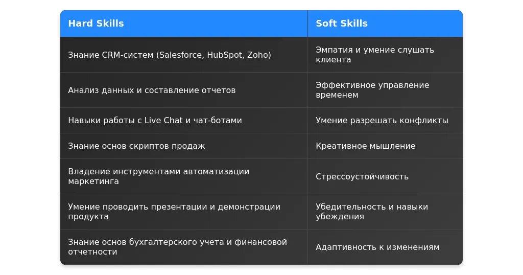 После адаптации: "Профессиональное владение CRM (Salesforce, Bitrix24), навыки ведения переговоров, аналитическое мышление".