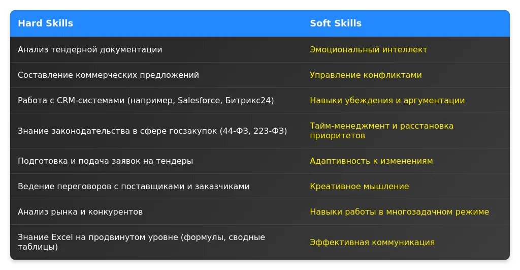 После адаптации: "Навыки взаимодействия с отделами закупок и юристов, высокая стрессоустойчивость в условиях сжатых сроков."