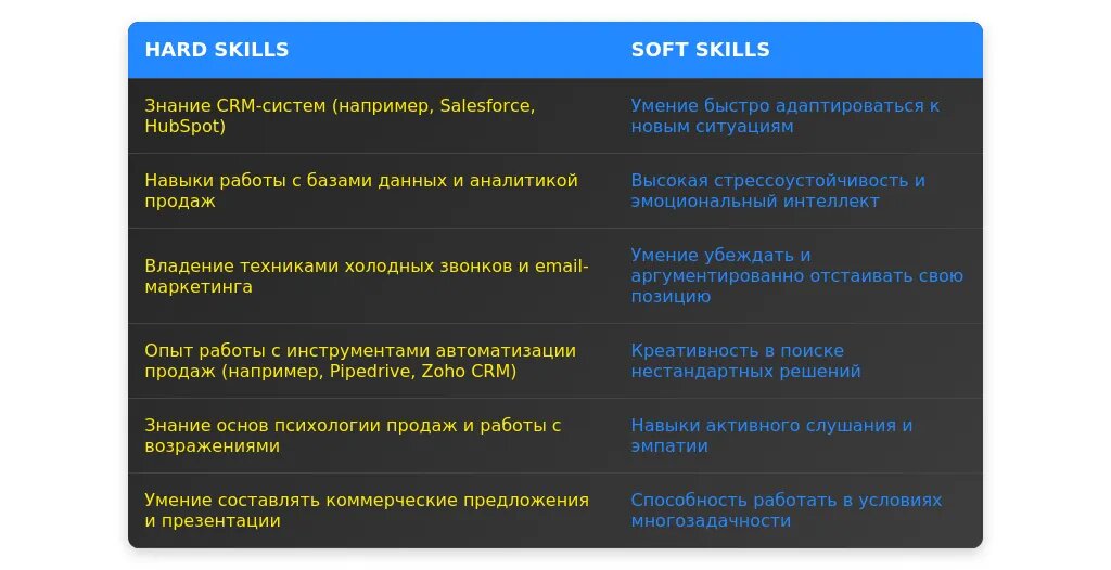 После адаптации: "Холодные продажи, работа с возражениями, знание CRM-систем (Bitrix24, Salesforce), английский язык — Intermediate."