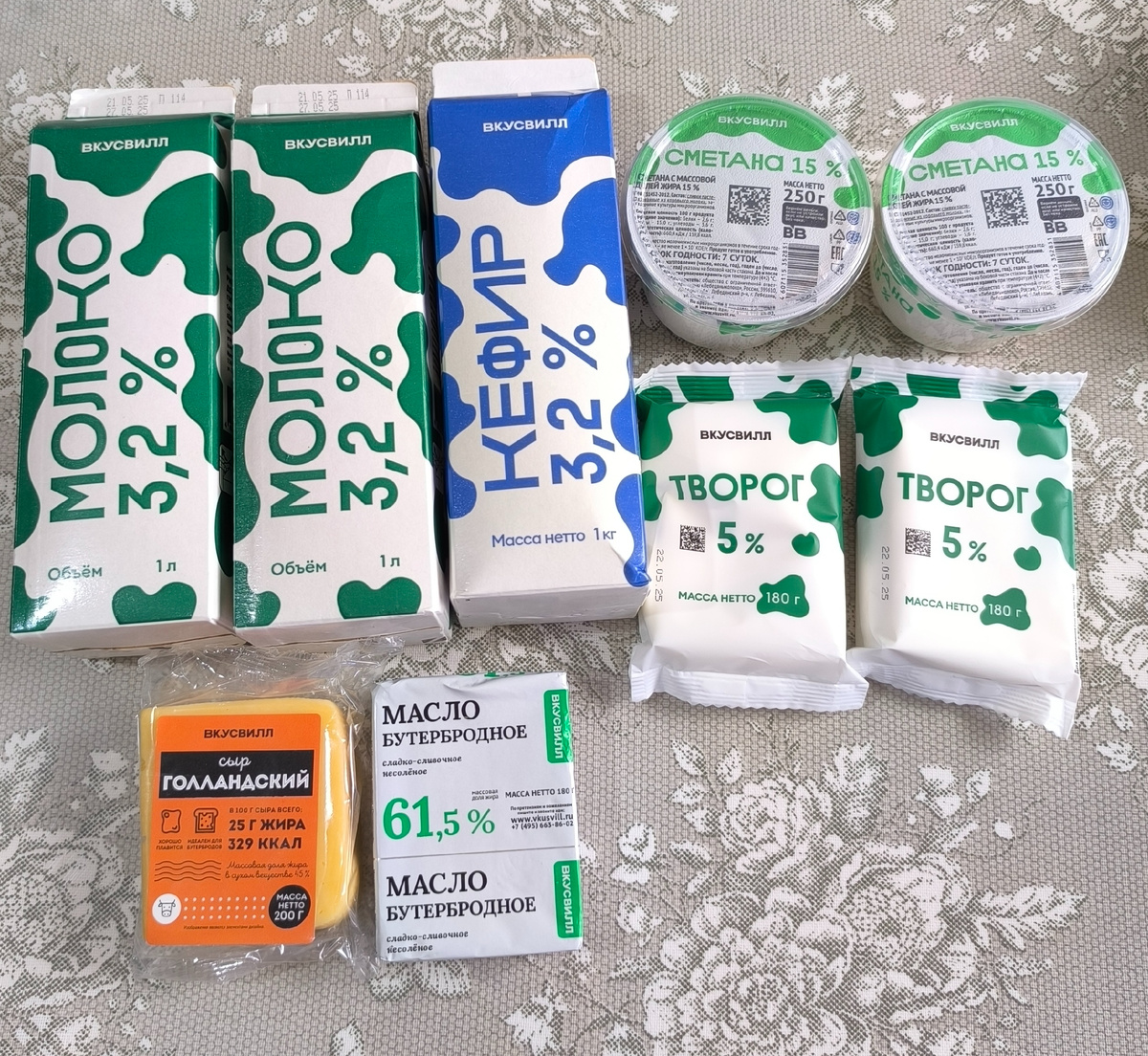 Проверить эту сеть на лояльность к обычному среднестатистического потребителю родилась давно. Но все время что-то мешало. То скандалы, интриги и расследования с некачественными салатами, то просто моя забывчивость... В этом году я решила опять подружиться с этой сетью. Я любитель все пробовать, экспериментировать. А в этой сети всегда очень интересный ассортимент. Для начала хочу попробовать пожить пару недель на скромный бюджет, понять возможно ли это в данной сети и стоит ли вообще игра свеч? Отличаются ли обычные продукты ВкусВилл от аналогов в других сетевых магазинах? Нужно ли переплачивать за приставки "эко" и "био" ? Кому интересен эксперимент, в его суть можно поподробнее вникнуть в статье по ссылке внизу. А вот, что же мне удалось купить на 2 недели, на двух взрослых. Из расчета 221 рубль на питание одного человека в городе Москве. 1. Молочка. Все продукты с небольшим сроком годности, придётся половину заморозить. Немного неожиданно, но вполне предсказуемо. Нам ведь обещают