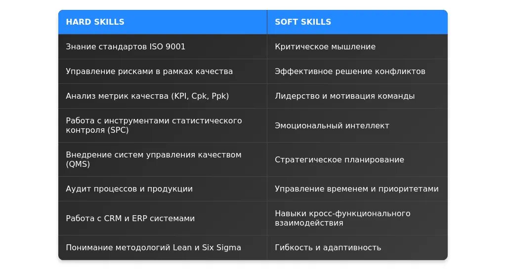 Какие качества и навыки выделить: внимание к деталям, аналитические способности, коммуникабельность, знание стандартов качества (ISO, ГОСТ).