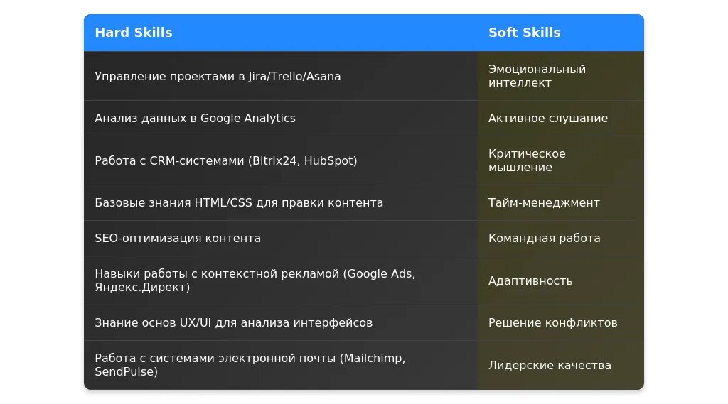 Пример 3: Навыки: "Excel, Trello, Bitrix24, Google Analytics, управление проектами."