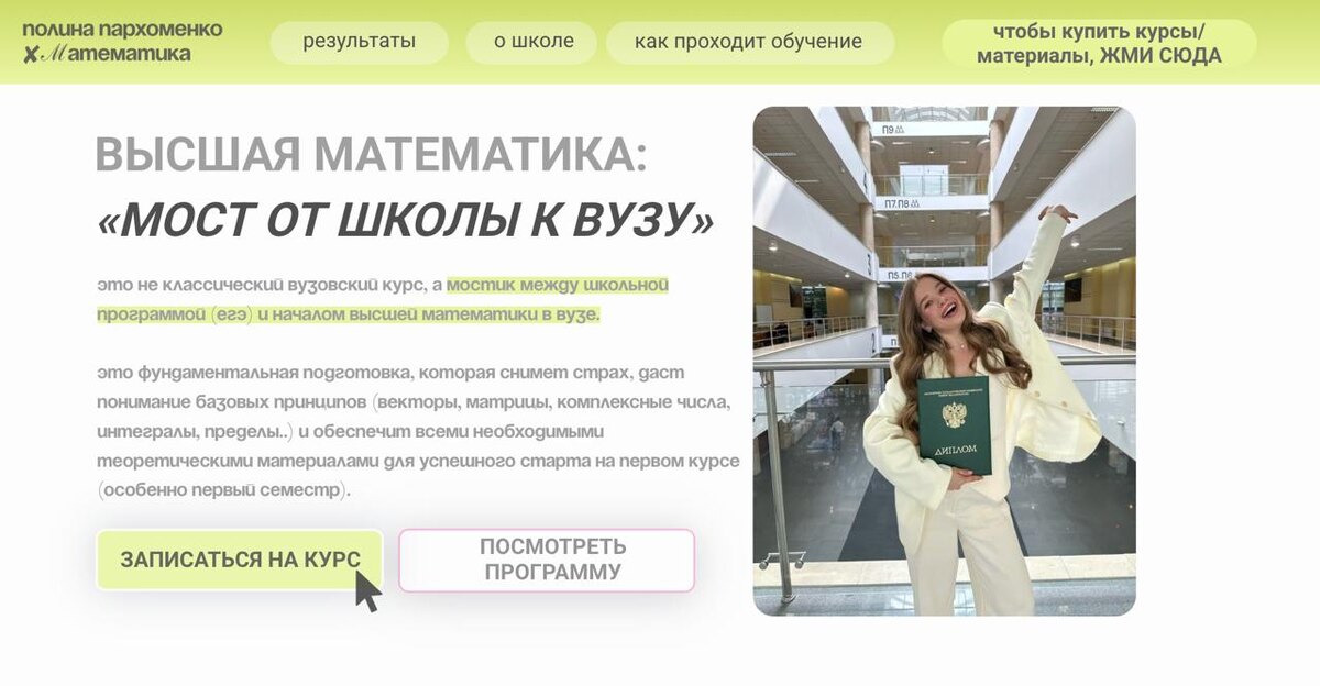 БОИШЬСЯ ВЫСШЕЙ МАТЕМАТИКИ В ВУЗЕ? 🤯 Это можно исправить за одно лето! ТВОЙ МОСТ ОТ ШКОЛЫ К ВУЗУ: Высшая математика без страха и зубрежки! Всё о высшей математике для абитуриентов и первокурсников ☺️☄️ https://poleine.ru/highermaths Лето, ЕГЭ позади… а впереди ВУЗ, и там ОНА – Высшая Математика! Стра яшно? Непонятно, с чего начать? Боишься, что не хватит школьных знаний? Я знаю, как тебе помочь! 🙂 Я создала уникальный курс 'Высшая Математика: Мост от Школы к ВУЗу' – твой личный проводник в мир матриц, векторов, пределов и интегралов. 🙂Это не скучные лекции, это легкий и понятный старт, который даст тебе мощную базу для первого семестра любого технического ВУЗа! 🎯 Что тебя ждет внутри курса: 🍋🟩освоишь базовые принципы высшей математики: векторы, матрицы, пределы, интегралы, комплексные числа – и поймешь, что это не так сложно, как кажется! 🍋🟩Никаких "птичьих" языков – только максимально простые объяснения от меня 🍋🟩Теория? Да! Но в формате красивых, интуитивно понятных