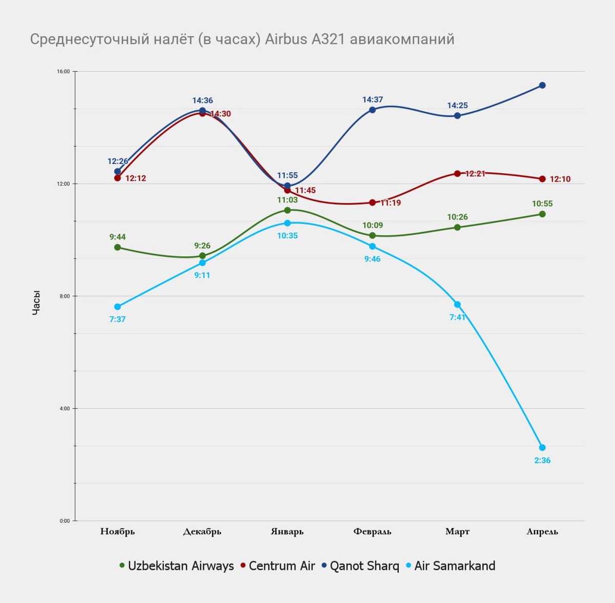 Среднесуточный налёт (в часах) самолётов типа Airbus A321 местных авиакомпаний Airbus A321 есть в парке у большинства местных авиакомпаний, поэтому можно наглядно посмотреть динамику среднесуточного налёта по этому типу самолёта. Чем больше времени самолёт летает, тем эффективнее он используется. На графике показан среднесуточный налёт самолётов типа Airbus A321 по каждой авиакомпании за последние 6 месяцев. #статистика #airbus #a321 #апрель2025