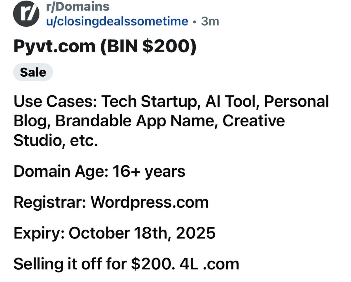Смотрите что нашел :) вкусняшка 🤤, отличный домен для вашего стартапа. Имя значит ровно ничего, но 4 символа и зона правильная. У самого слюни текут …