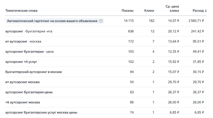 ⚠️ Задача: Получить максимальное количество качественных переходов на сайт (нужны клиенты, но не частные лица) 💰 Бюджет: 14000 на 2 недели 💻 Площадка: Яндекс (поиск) С клиентом начали работать еще давно. Пробовали разные подходы через таргет в инсте*, но к сожалею данная ниша не поддалась аудитории из инсты. Решили попробовать контекстную рекламу в рекламной системе Яндекса (РСЯ). Для начало потребовалось обрисовать портрет целевой аудитории, затем составить рекламную стратегию. А после проделанной работы я приступил к поиску ключевых слов (какие запросы чаще всего используют для IT-аутсорсинга). Результаты смотреть ниже. А вот какие заголовки и тексты объявлений оказались отличными, а какие плохие: А на рисунке ниже показана ЦА м/ж и возраст. Таким образом, наша ЦА-Муж и Жен 25-44 Ну и, конечно, куда же без самих цифр по тратам и стоимости клика: Потрачено: 14 000р