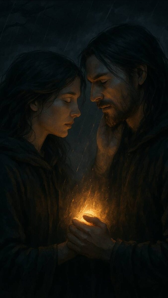— Мне страшно, мне очень страшно, — она смотрела в его глаза и вцепилась в его руку, — мне страшно, сказать тебе, что ты мне нужен, опереться на тебя, мне страшно, потому что кажется, что сново исчезнешь и оставишь меня одну, в этом странном и чужом мире. Он обнял: — Мне тоже страшно. И её расслабило. Теперь, когда он не даёт обещаний, когда не холоден в своей силе, она верит. Его руки были в крови. Шрамы на теле перекрывали друг друга. Пыль покрывала его одежды. Она была безоружна, все сотни лет, поэтому научилась держать кинжал за спиной. Теперь клинок ей не нужен. Колени — в ссадинах, на лице жила усталось. Но их глаза. Их глаза смотрели в глубины, в которые не осмеливались взглянуть. Они смотрели —ни в осколки разбитых зеркал, отражения...а в самих себя. Он знал — через что ей пришлось пройти, он чувствовал это кожей. Она помнила каждый его бой — победы и поражения, плен, отчаяния. Они познали бессилие друг друга и познали силу. Они шли порознь, но всегда вместе. Ведь серд