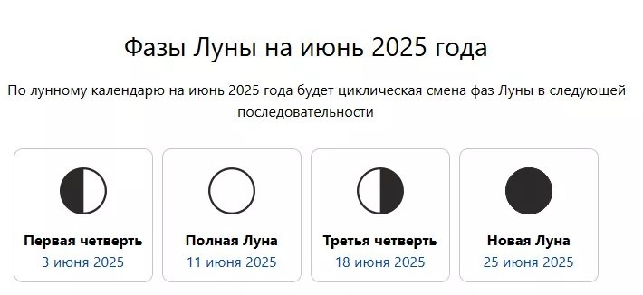 Лунные календари на июнь 2025 года: Узнайте, какие дни будут благоприятными для разных дел в июне! 🔹 🌗 Лунный календарь на июнь 2025 года — Полезная информация о фазах Луны и их влиянии на вашу повседневную жизнь: Подробнее (https://mirkosmosa.ru/lunar-calendar/phase-moon/2025/june) 🔹 ✂ Лунный календарь стрижек на июнь 2025 года — Когда лучше стричь волосы для здоровья и красоты? Подробнее (https://mirkosmosa.ru/lunar-calendar/haircut/2025/june) 🔹 🌱 Лунный календарь огородника и садовода на июнь 2025 года — Благоприятные дни для посевов, посадок и других садовых работ! Подробнее (https://mirkosmosa.ru/lunar-calendar/garden/2025/june) 🔹 📅 Лунный календарь дел на июнь 2025 года — Удачные дни для решения важных задач и начинаний. Подробнее (https://mirkosmosa.ru/lunar-calendar/work/2025/june) 🔹 💍 Лунный календарь свадеб на июнь 2025 года — Выберите день для вашего идеального торжества. Подробнее (https://mirkosmosa.ru/lunar-calendar/wedding/2025/june)