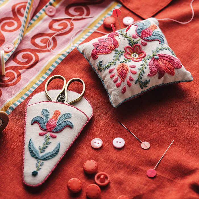 Эти восхитительные аксессуары, украшенные тюльпанами и лилиями в оттенках розового, бирюзового и павлиньего синего, выполнены на льне цвета слоновой кости с использованием шерстяной пряжи и отделаны линией узелкового жемчужного шва, а игольница закреплена в центре пуговицей цвета слоновой кости.