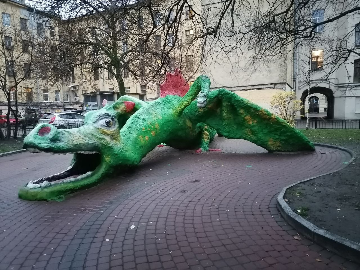 Продолжая рубрику интересных дворов Петербурга, сегодня хочу рассказать о детской площадке со Змеем Горынычем на Васильевском острове. Во внутреннем дворе дома № 23 по 8-й линии Васильевского острова расположился почти 7-метровый Дракоша. Слышала, что его часто символично называют Васькой. Также в Интернете находила информацию, что все его три головы имеют имена: Гоша, Федя и Егор. Кто есть кто, к сожалению, не знаю. Исходя из информации из различных источников можно сказать, что Змей Горыныч появился здесь примерно в 1978-1980 годах. Автором этого творения являлся художник Владимир Александрович Трубаков, который, переехав в Ленинград, устроился плотником в «Жилищно-эксплуатационный трест № 4» на Васильевском острове. Именно он по собственной инициативе занялся строительством Змея Горыныча из железобетона в одном из дворов Васильевского острова. Исторически дракон был зеленого цвета, а также являлся полым внутри, то есть детки могли пролезть через пасть и вылезти сбоку в районе хвоста