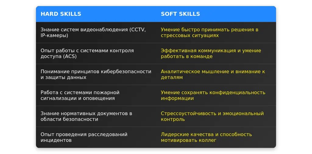 После адаптации: "Знание систем видеонаблюдения, контроль доступа, ведение отчетности, знание законодательства в области безопасности."