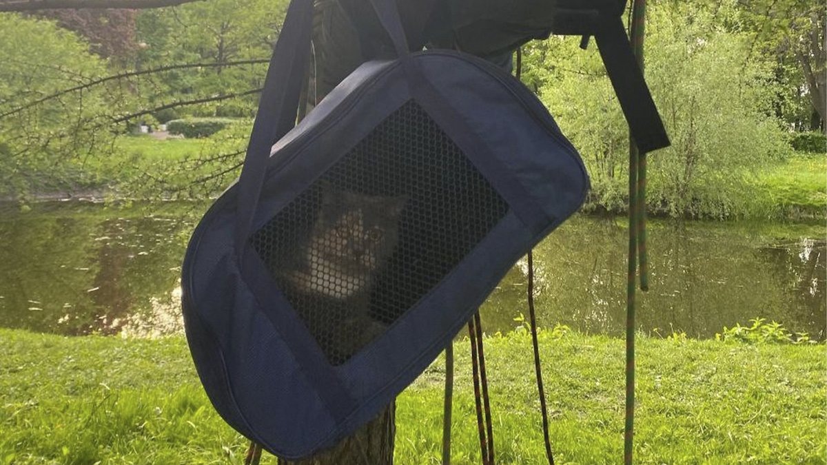 Внизу растянули тент на случай падения кошки, но Леониду удалось дотянуться до нее ловчей петлей, поместить в переноску и спустить вниз.