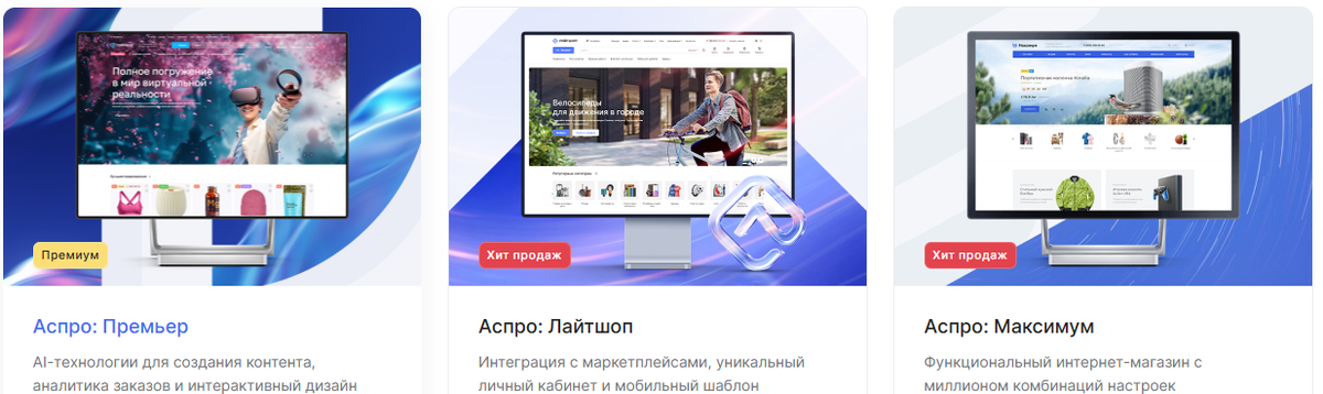 - Aspro: Премьер — премиум-решение с AI-функциями, аналитикой заказов и интерактивным дизайном.