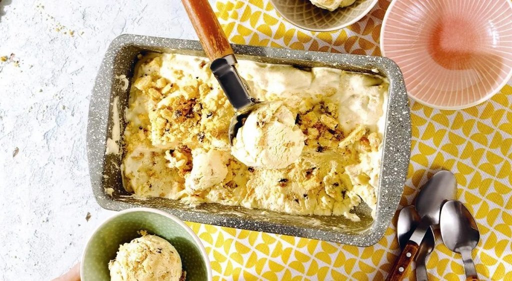 Домашнее сливочное мороженое с кусочками печенья приготовить проще простого. Печенье для мороженого можно испечь самостоятельно или использовать готовое мягкое печенье из магазина. В основе такого печенья классический заварной крем на смеси желтков с сахаром и молоком, который после остывания взбивается вместе с жирными сливками. В отсутствие специальной мороженицы, которая одновременно охлаждает и перемешивает массу, придется повозиться чуть дольше, но результат будет того стоить. Очень важный этап приготовления мороженого – регулярное перемешивание содержимого контейнера вилкой до однородности. Это необходимо для насыщения массы пузырьками воздуха и получения привычной гладкой текстуры мороженого. ИНГРЕДИЕНТЫ НА 4 ПОРЦИИ 300 мл молока 200 мл сливок жирностью 33% 4 желтка 100 г сахара 50 г коричневого сахара 1 ч. л. ванильного экстракта щепотка мелкой соли 400 г теста для печенья с кусочками шоколада Разогрейте духовку до 180°C. На листе бумаги для выпечки раскатайте тесто в пласт тол