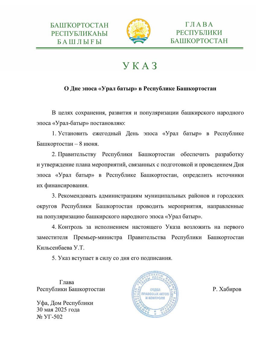 Указом Главы Республики Башкортостан Радия Хабирова 8 июня устанавливается Днём эпоса «Урал-батыр». Запланировано, что значимая дата будет отмечаться ежегодно. Правительству региона поручено разработать и утвердить соответствующий план мероприятий, муниципалитетам также рекомендовано разработать и провести мероприятия по популяризации эпоса.